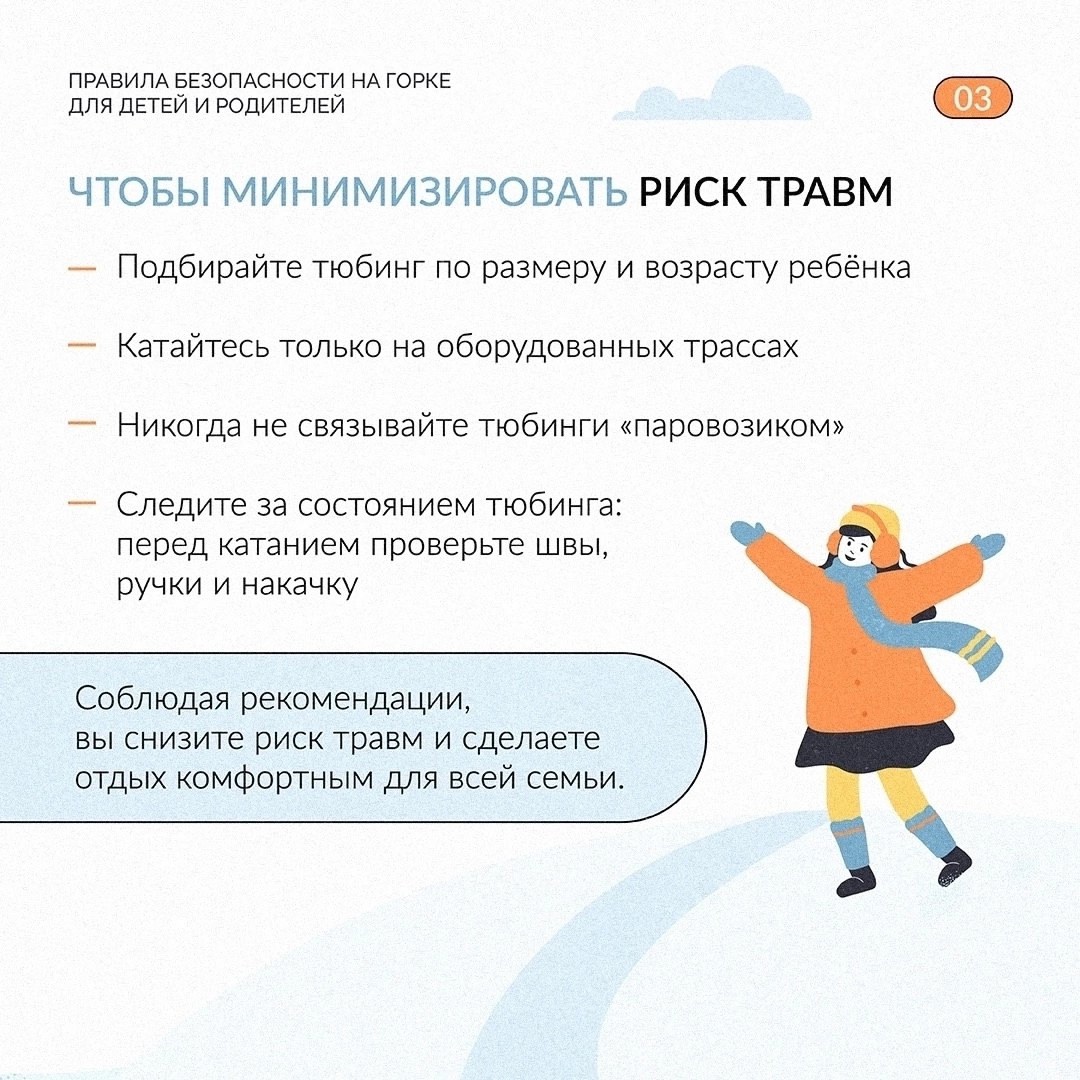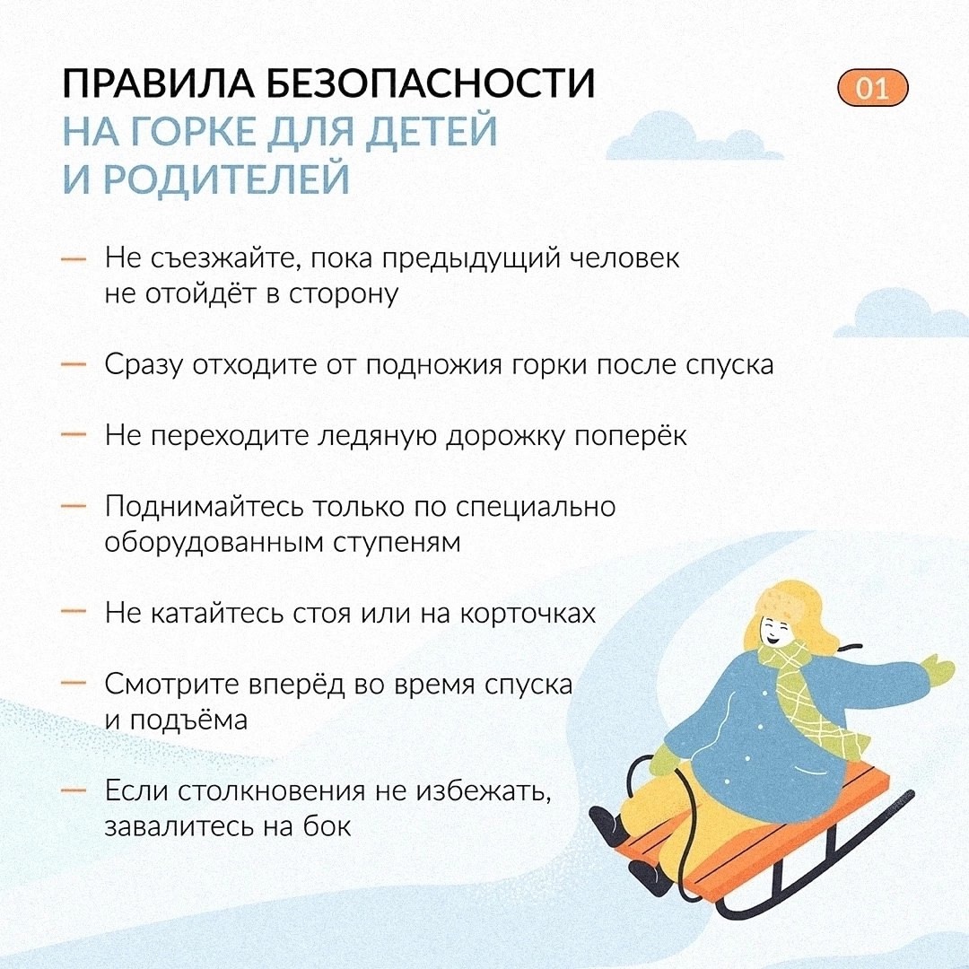 ❗ С наступлением снежной зимы на горках можно наблюдать настоящий аншлаг. Чтобы веселые выходные не закончились приемом у врача-травматолога, напоминаем родителям о базовых правилах безопасности.