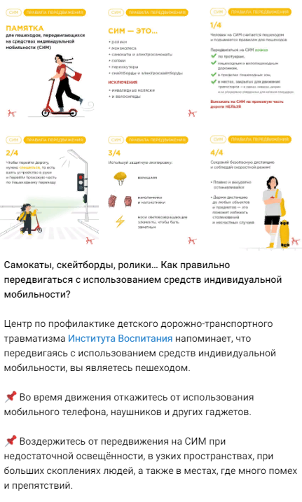 как правильно передвигаться, используя средства индивидуальной мобильности (https://t.me/institut_vospitaniya/1348; https://vk.com/wall-113551114_6889);