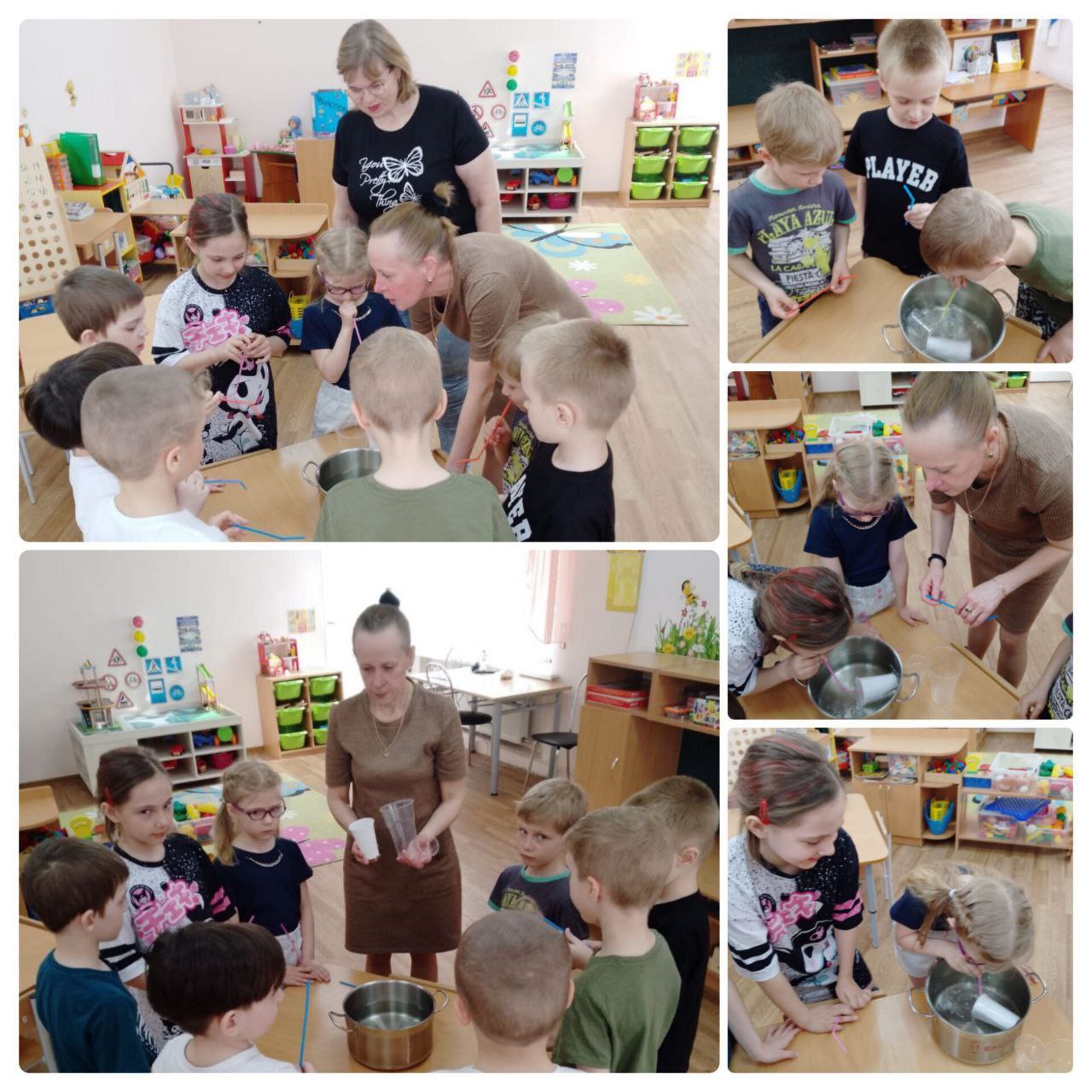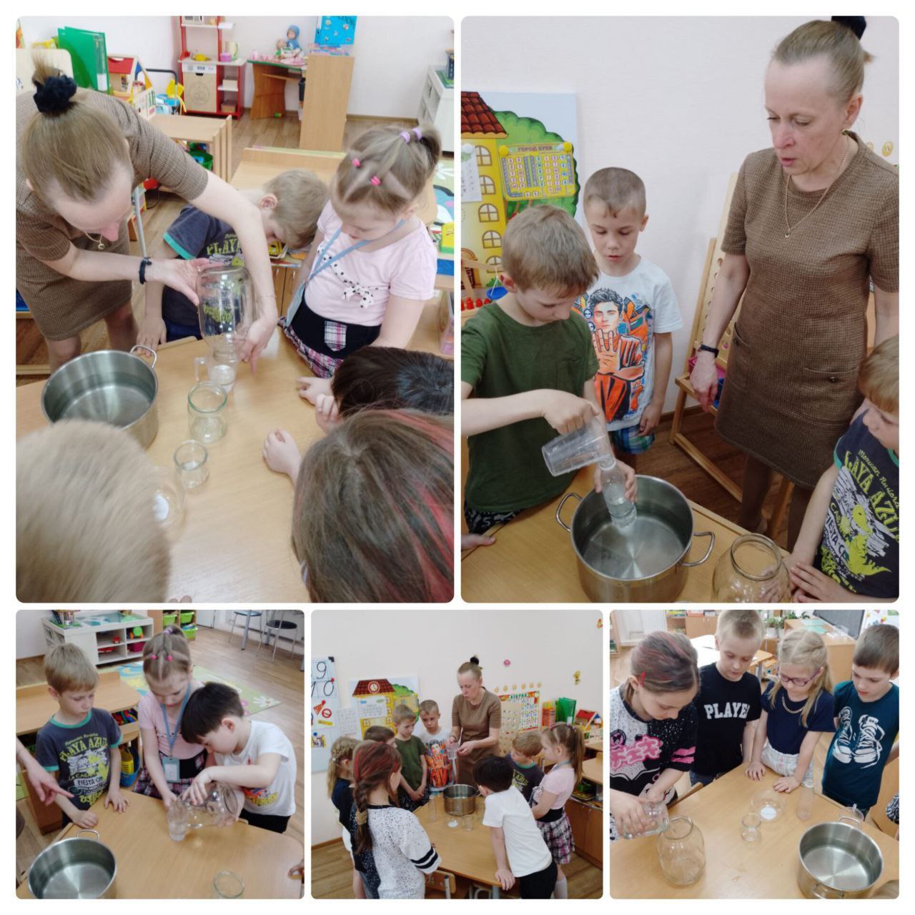 Ребята подготовительной группы " Пчелки" вместе с воспитателем провели опыты с водой "Меняется ли объём воды при переливании её в разные по объёму сосуды" и " Почему плавает подводная лодка".