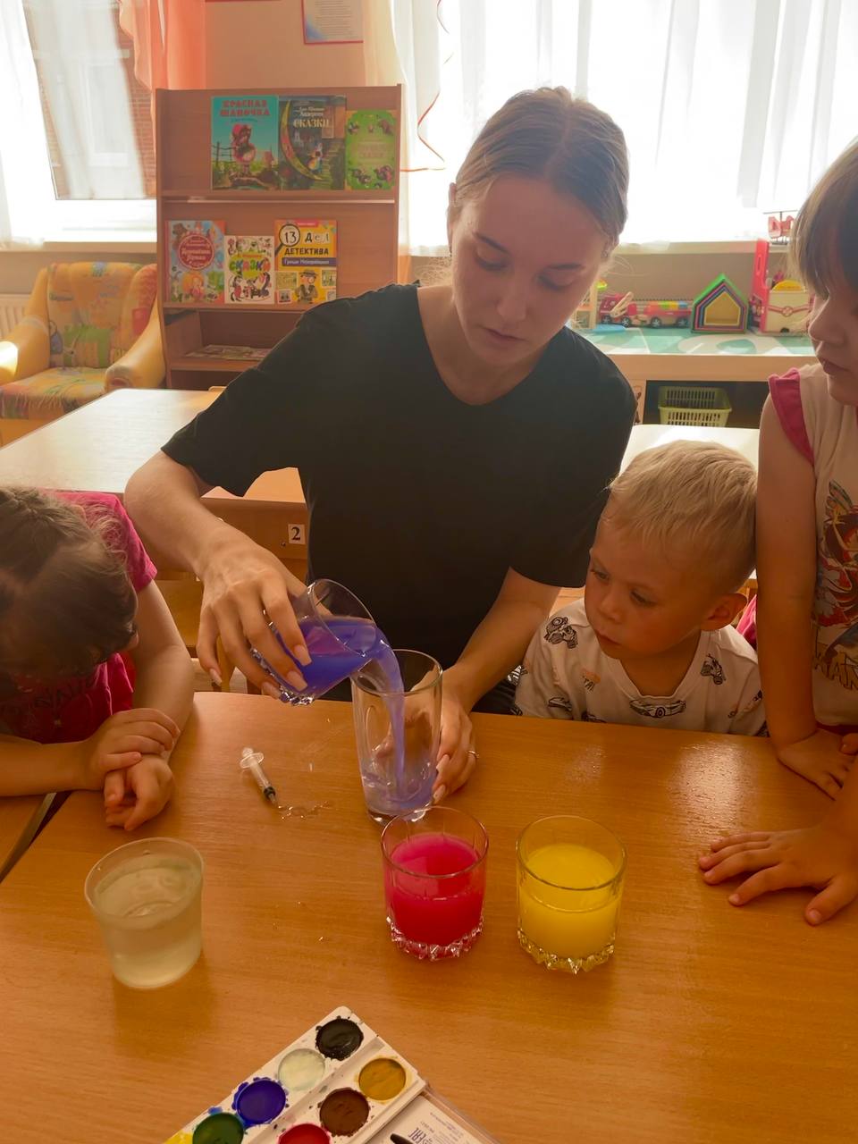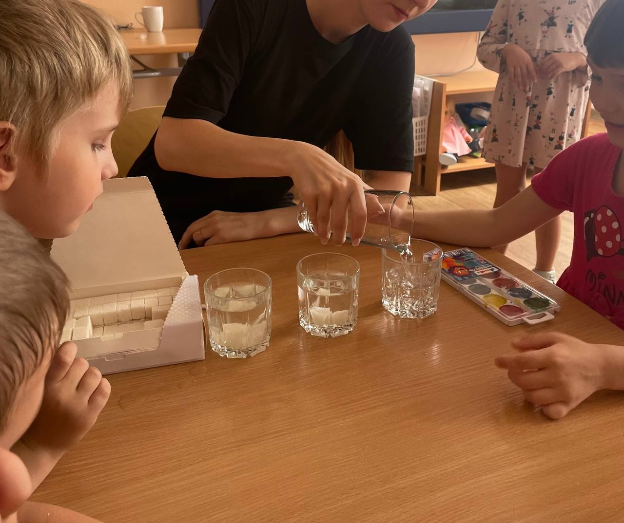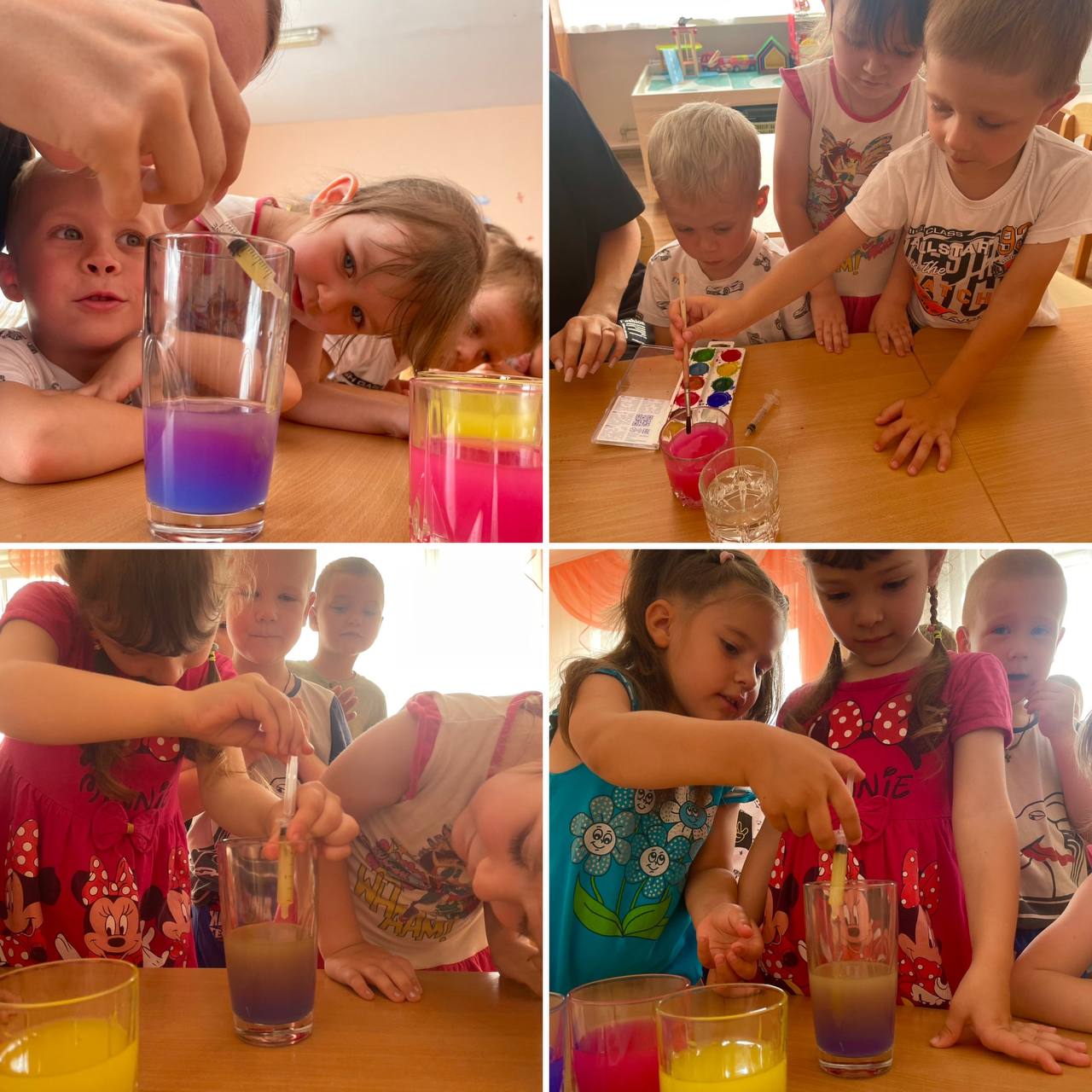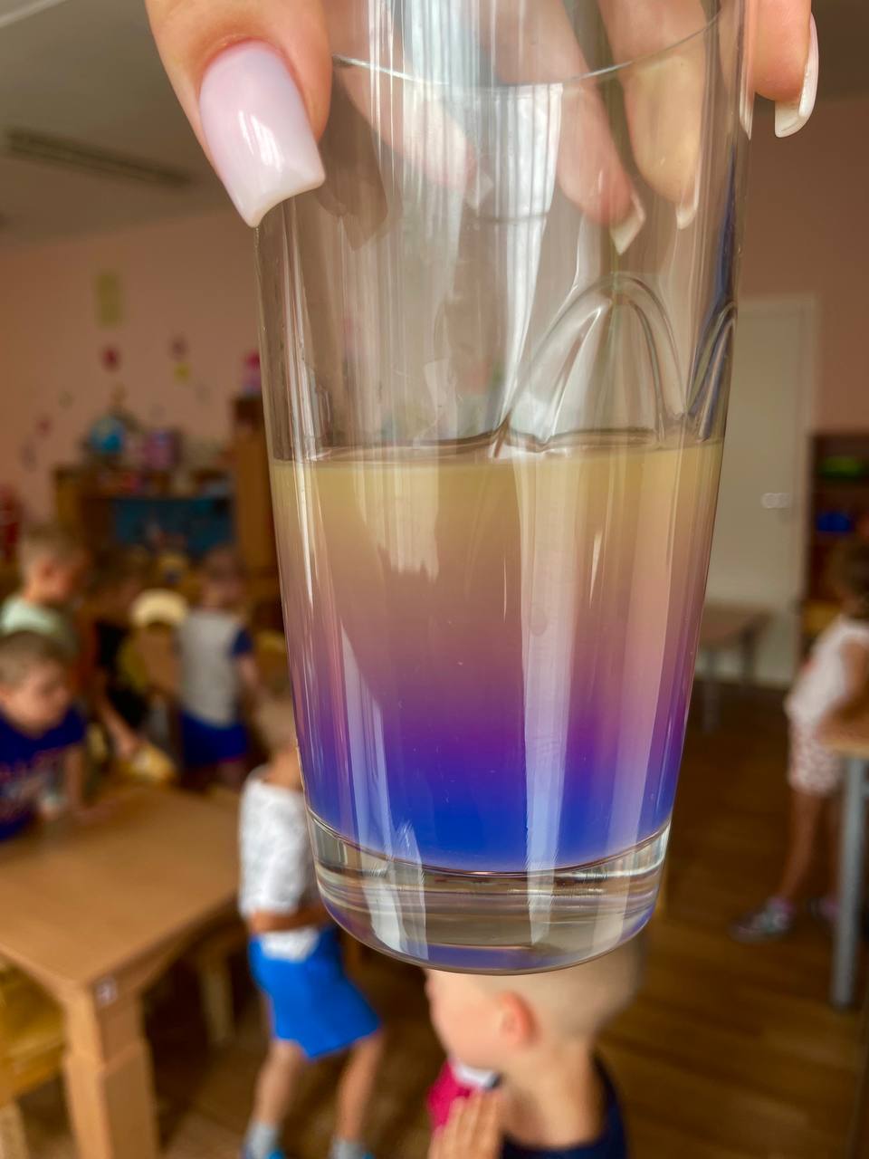 В 3 прозрачных стакана налили воды. В каждый из них добавили разное количество сахара, а воду в стаканах окрасили разными цветами. Затем взяли большой бокал и по очередно с помощью шприца аккуратно добавляли туда воду из стаканов. В конечном итоге краска в воде не смешивалась, как мы привыкли, а наслаивалась друг на друга. Это происходит потому, что плотность воды разная, из-за этого каждый слой воды не тонул, а оседал.