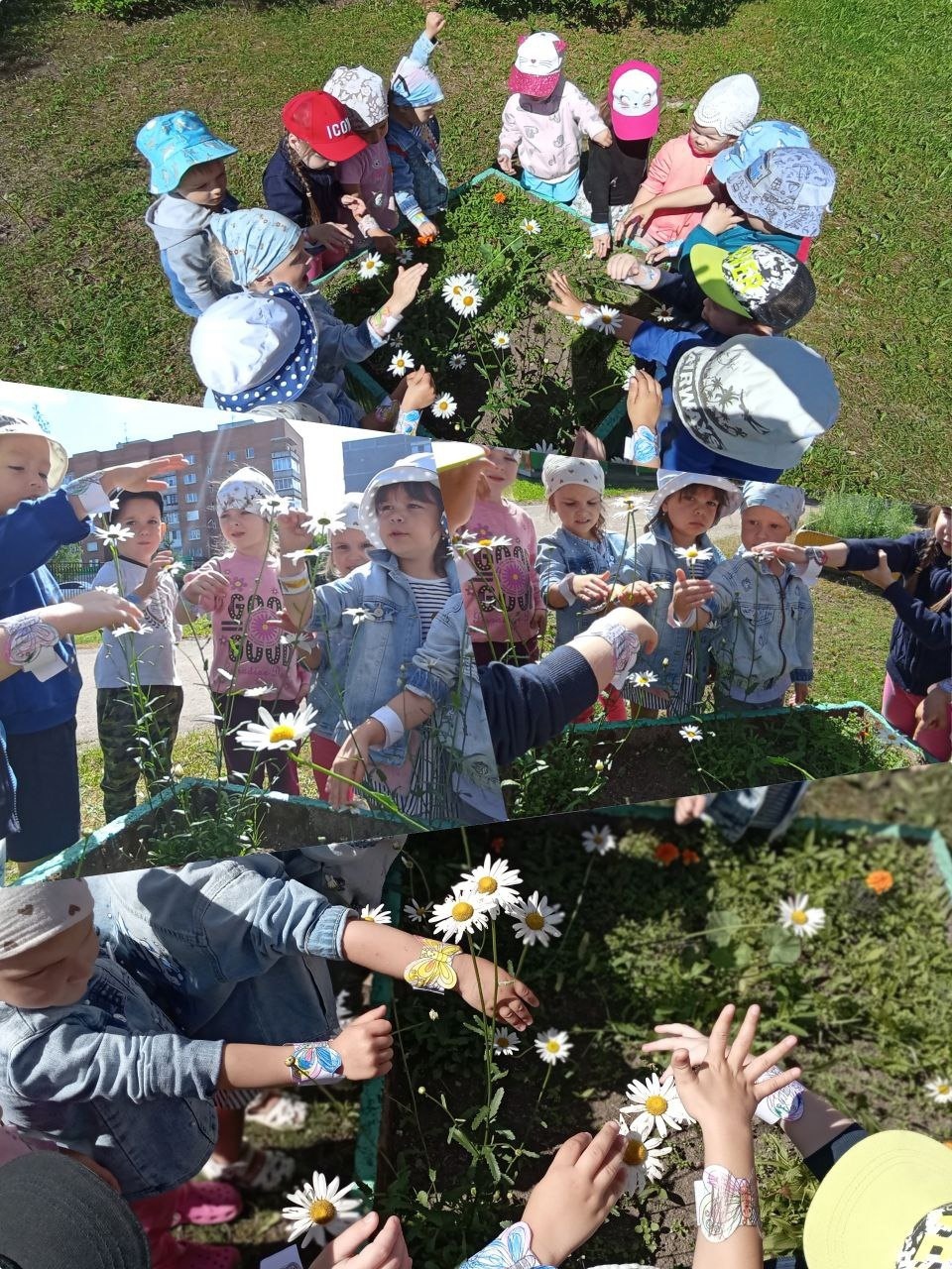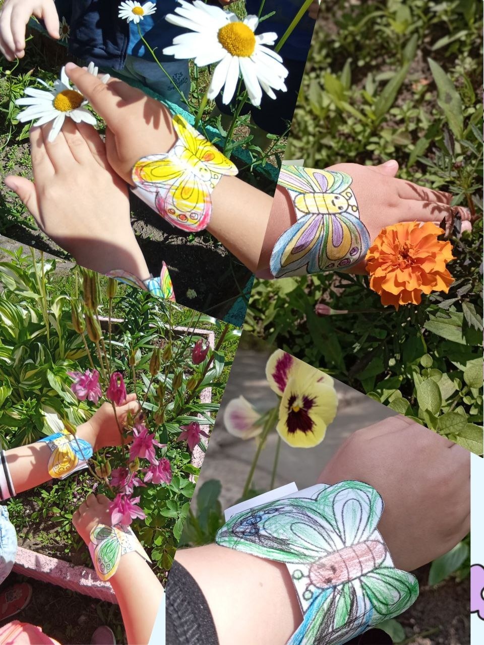 Ребята нарисовали бабочек не простых, а в виде браслетиков-бабочек которыми на прогулке играли превратившись в бабочек, которые прыгают с цветочка на