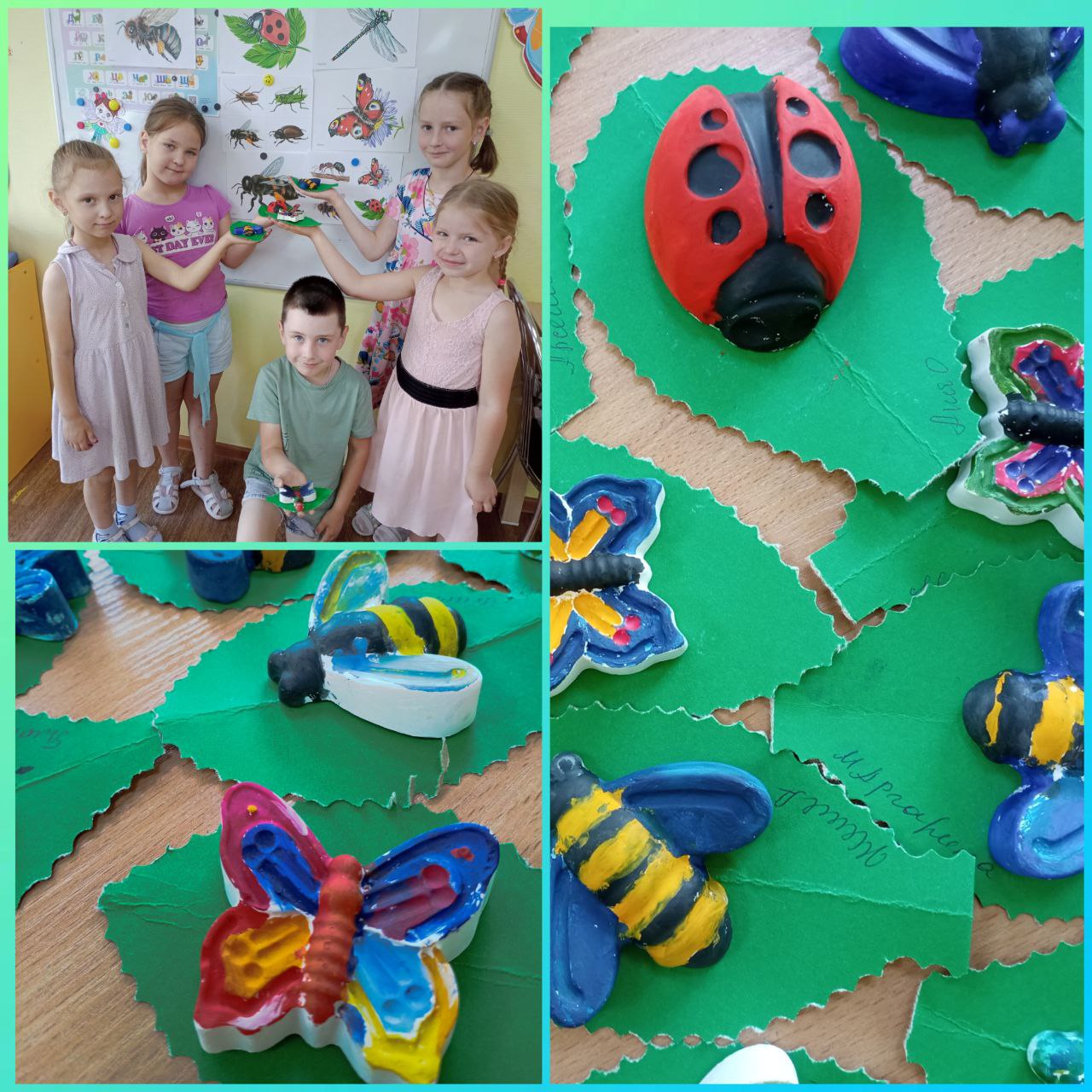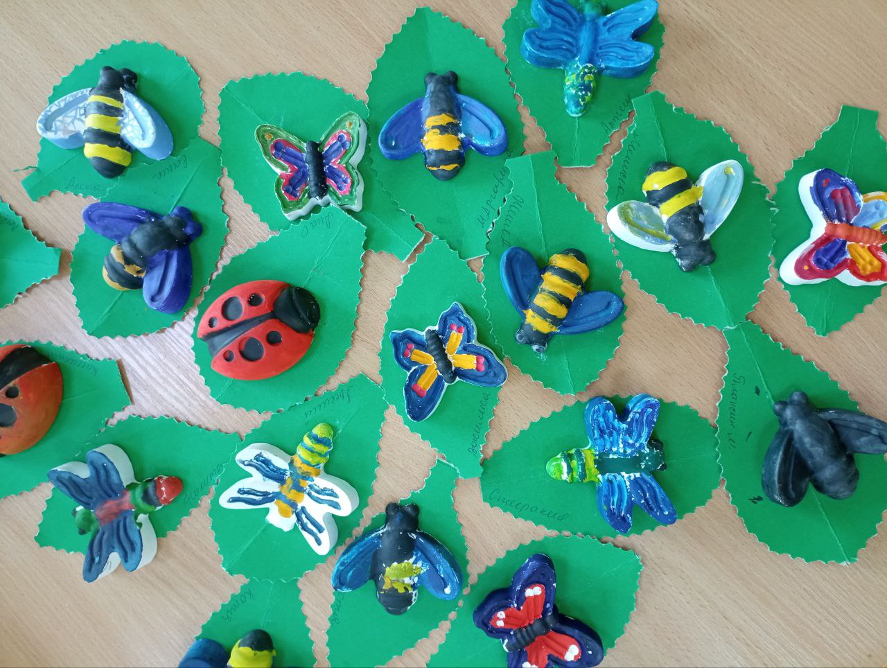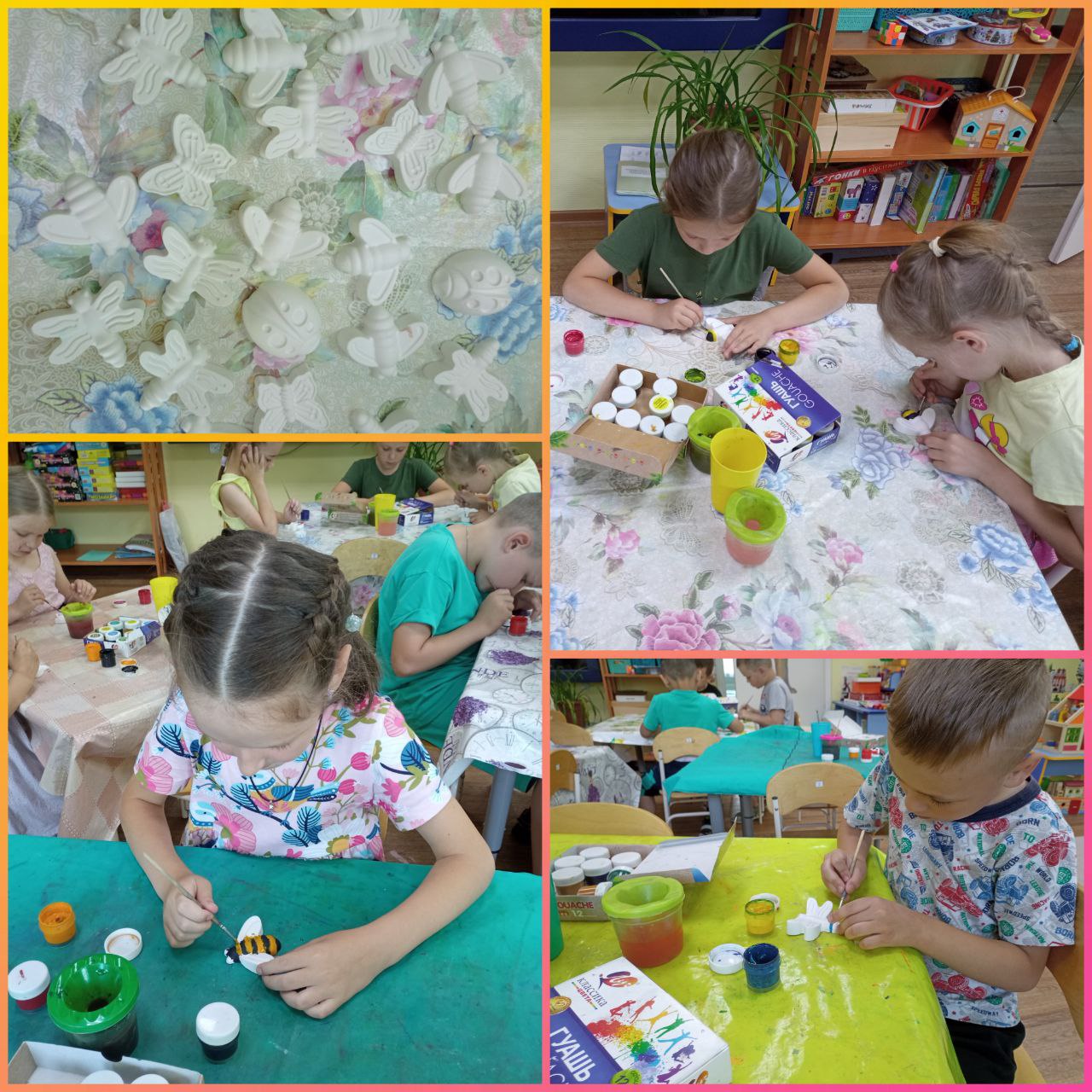 Ребята из групп "Радуга" и "Вишенка" раскрашивания гипсовых фигурок насекомых .
